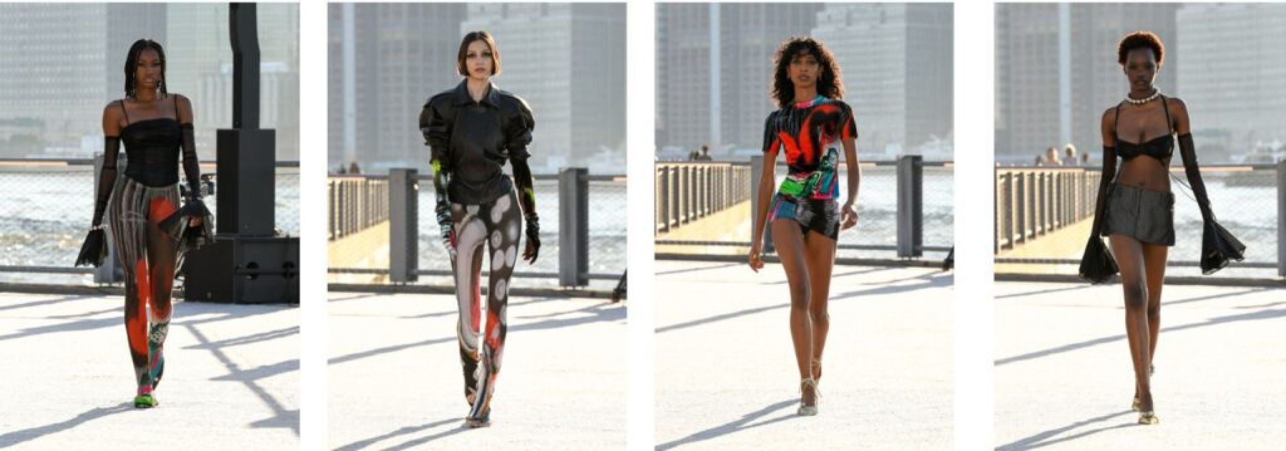 A sharp display of feminine silhouettes Campbell’s line established in 2018 was on a hiatus due to the pandemic. In press about this collection she shares the process of creating this collection and says, ” During the pandemic I had become so frustrated with fashion that I stepped away entirely and started doing random illustrations. I have no idea why I just ran with it, maybe because a sketch is cheaper to make than a garment. What started with black and white cartoon like drawings of cosmic characters transformed into bold colorful paintings of abstract symbols with textured backdrops. I only found